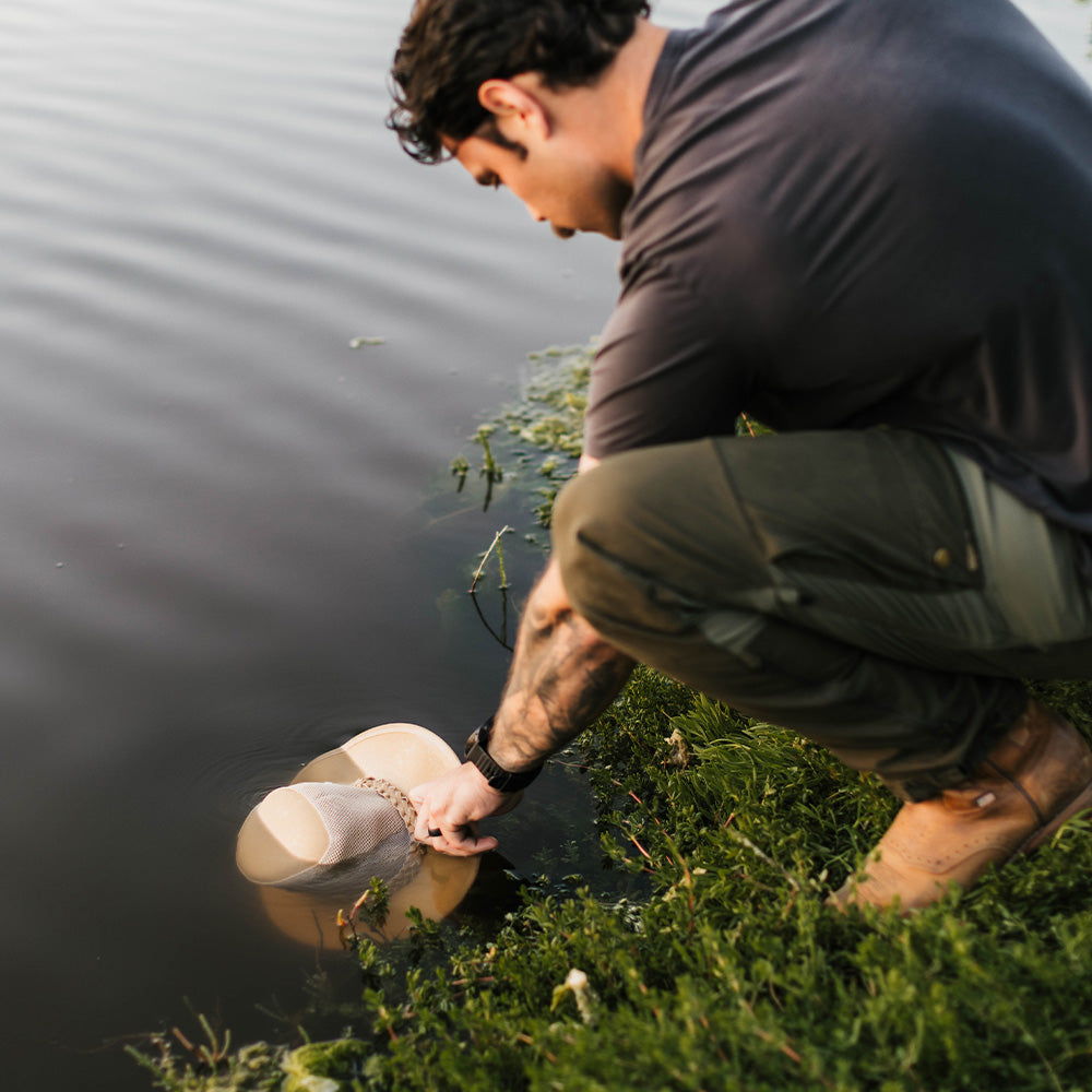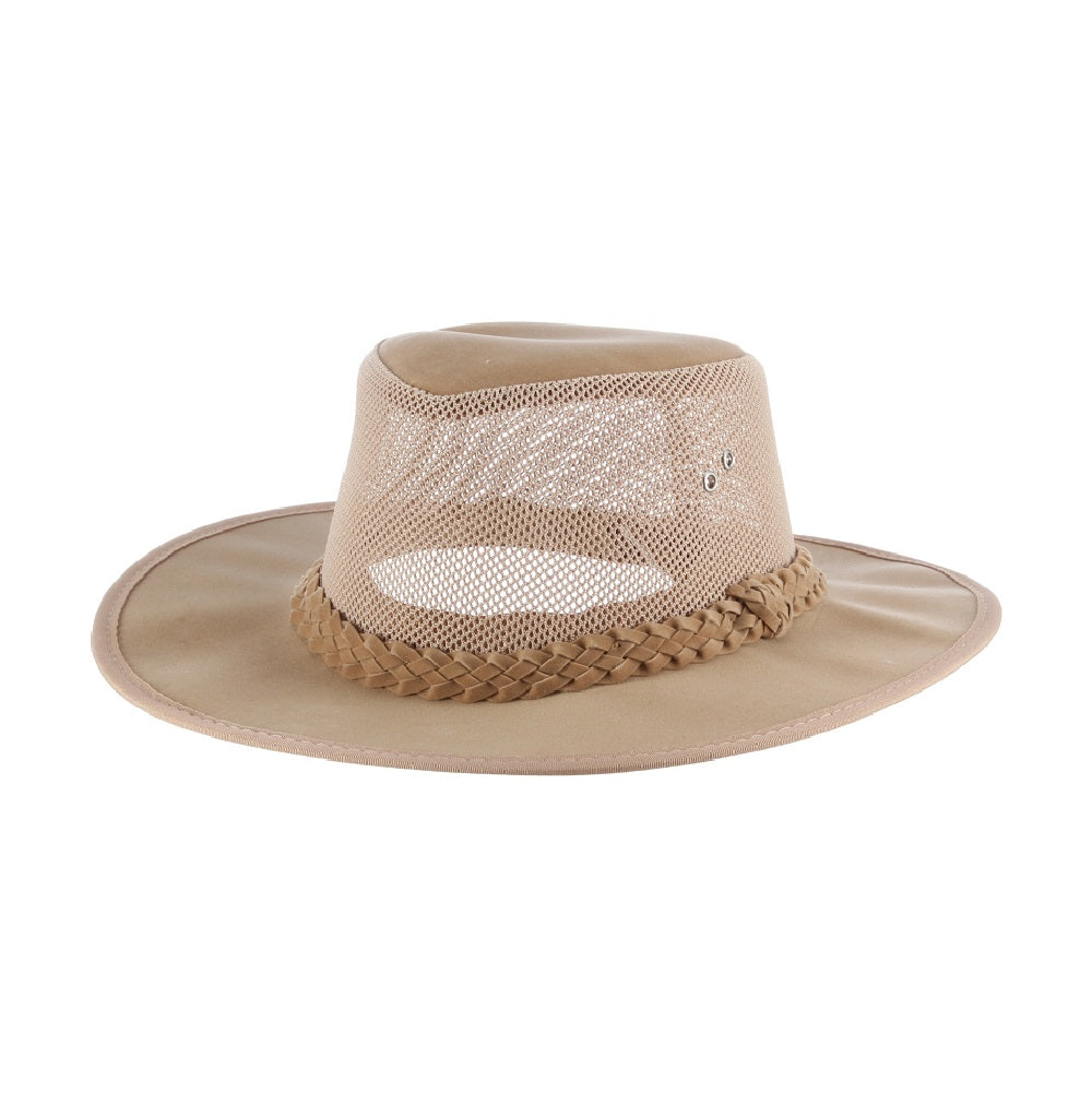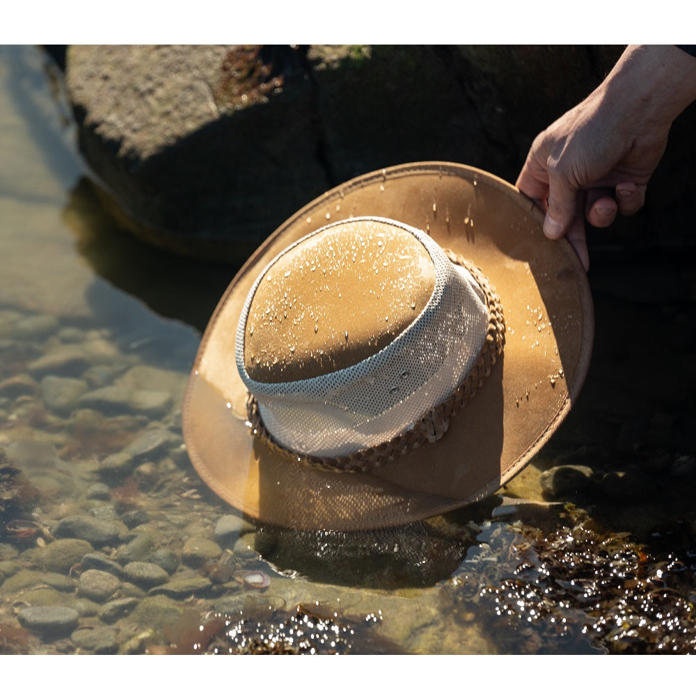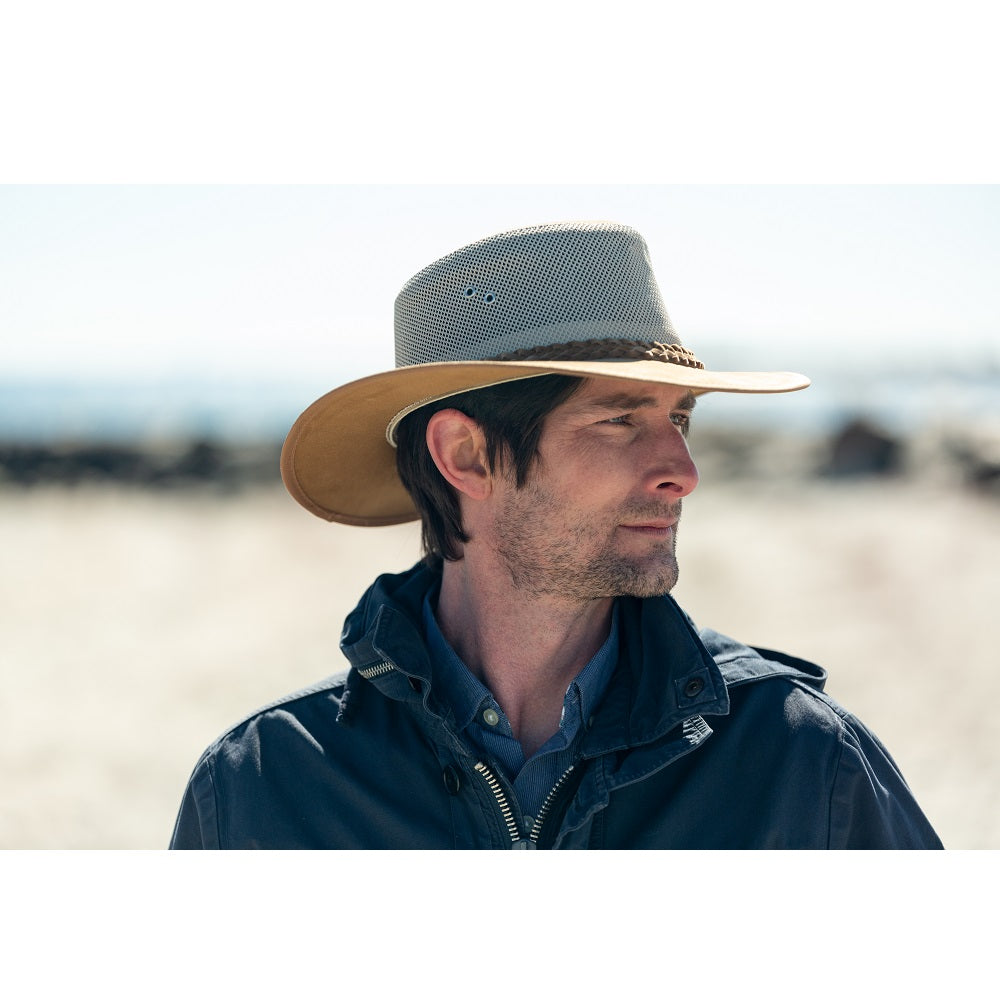 When the warm weather calls your name out onto the porch at night, you're going to want your favorite hat with you. This canvas Aussie hat with mesh crown is lightweight and stylish, ensuring the ideal summer night.