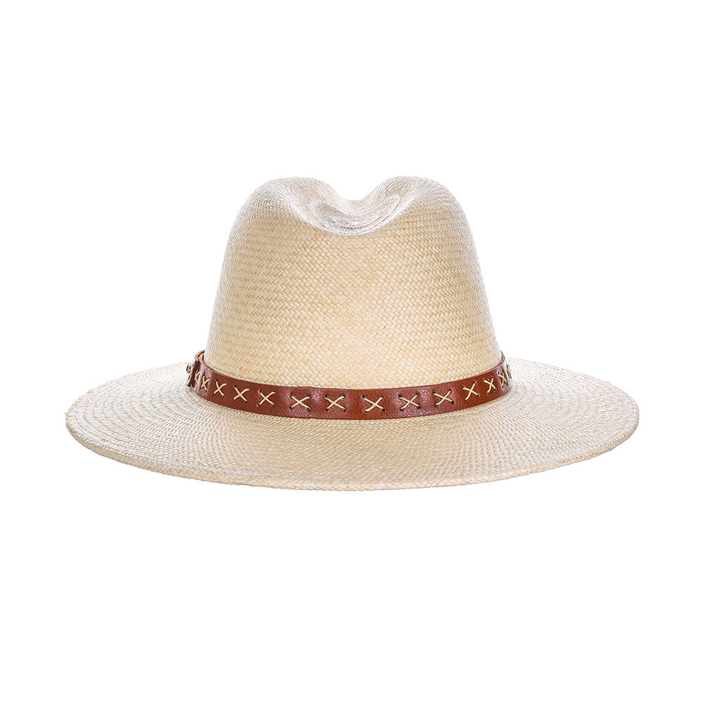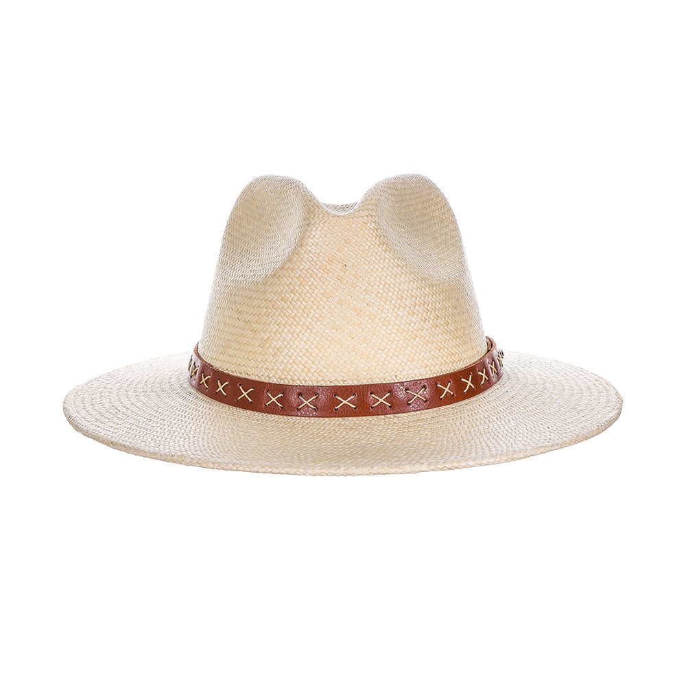 This handwoven Panama is one-of-a-kind. Constructed of high-quality handwoven Panama and equipped with a unique cross-stich vegan leather band, this distinctive, yet sophisticated, hat will quickly become your favorite accessory this summer.