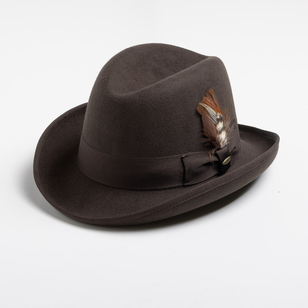 When the occasion calls to dress to the 9s, reach for the Godfather homburg. Made of genuine wool felt, and equipped with a grosgrain band and feather, this hat will complete your ensemble.